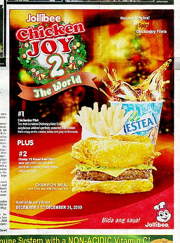 I just heard from a friend on Facebook that she overheard someone trying to order the rumored Jollibee Champion Meal, supposedly Jollibee’s competing new product against KFC’s Double Down, which I haven’t tried yet, by the way.