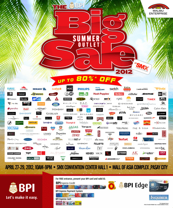 It’s that time of the year again when BPI, Philippine Daily Inquirer and Malibu Enterprise bring you one of the BIGGEST annual sale events you MUST not miss! This time, you can get as much as 80% off from brands we all know and love. It’s the BIG Summer Outlet Sale 2012!